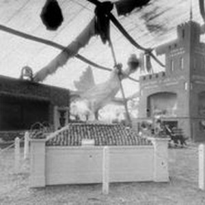 Photo--black and white, from Borba celluloid negative: Gravenstein Apple Show display of a large chicken standing among apples. This is possib ly a Petaluma display. In the background right a display of the State of California Department of Agrigulture To the left is a display of the San Francisco Bay Counties Air Base Terminal. Within the "building" made of apples is an airborne dirigible of apples that is tethered to a pole.