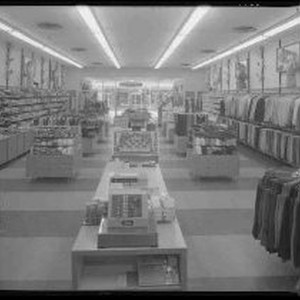 SERIES of four pictures of the interior and exterior of the National Shirt Shop in Southgate Shopping Center.