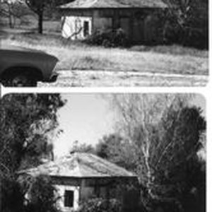 Photo--color: Two photos of Luther Burbank's Gold Ridge Experiment Farm cottage in April, 1974 before restoration in 1983. The windows and doors are boarded up. Photos are taken from the left front (looking west)