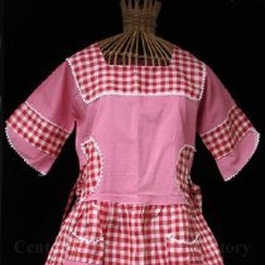 Dress made of pink, red and white cotton with white trim, two pockets, and sashes that tie at the sides . There is not interior label and the dress appears to be homemade.