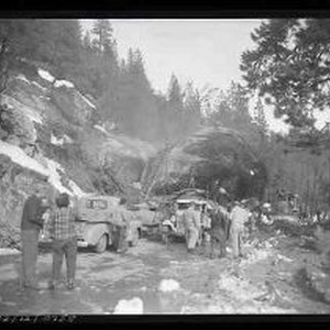 2/4/52 - Large boulder blocks highway above Kyburz. People and equipment in roadway - 5 of 6
