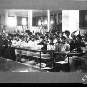 Hat Store, large group mostly women behind womens had display. Note: Print is on contact sheet numbered 93/013/961