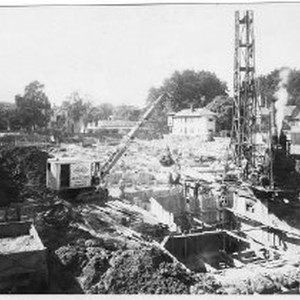 Exterior view of the construction site for the new Sacramento Post Office and Federal Courthouse at 805 I Street between 8th and 9th Streets. This is a general view facing northwest showing the pile driver on the right.