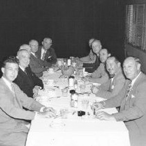 Ten unidentified men seated at a dinner table in the Sacramento Air Materiel Area, McClellan Field CA.
