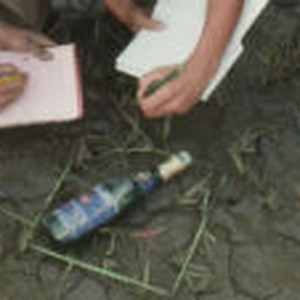 Close up of students hands and notebooks, with discarded bottle of Cold Duck and small plastic toy airplane.