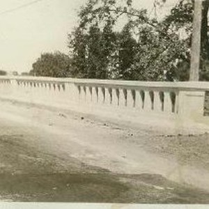 View of the Ninth Street Bridge after completion. This bridge is located just outside of Modesto. Sign on bridge contains names of the County Board of Supervisors and Charles W. Deterding, County Engineer.