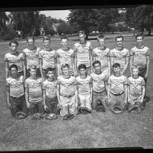 Orioles team photograph all wearing BEE-KBEE All Star shirts. Jack Gilligan, coach