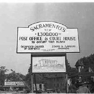 A sign announcing "Sacramento's $1,300,000 Post Office and Court House To Occupy This Block".