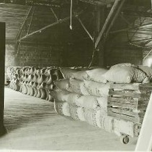 Interior view of sacks filled with almonds and stacked in the Lodi Almond Growers warehouse. Bags stamped with "California Almond Growers, Exchange, Nonpariel" but the rest is not visible.