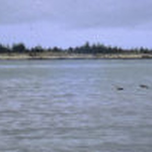 Distant view of three loons swimming in an expanse of water.