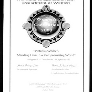 Annual women's convention program, "Virtuous women: standing firm in a compromising world", Saintsville Sanctuary Church of God in Christ, Texas Northeast, Dallas, Texas, 2003 April 23-25. Copy 2. [Description English/roman)]