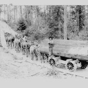 Photo--black and white: Photo identified by Ralph Sturgeon as "Logging 116." From collection of John Ahl of Santa Rosa, CA. Mr. Ahl married Maude Mayfield. Her father George Mayfield ran several hotels in Freestone, CA. Charles Hamilton is the man on the left next to horses. This picture could be either Charles Fullers or Melvin Meeker's logging operation.