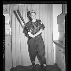 SERIES. Shows Osenbaugh in All Star Uniform posing with a bat.