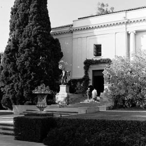 Three visitors walking up the steps to the west entrance of the library building. A slightly cropped version of this image is in HIA 60.1.14. MS note on verso reads "1958."