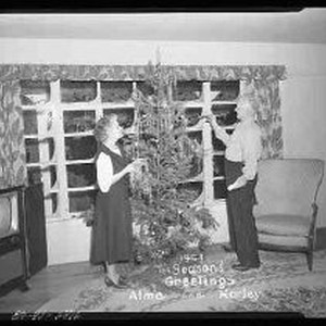 A picture of a couple decorating a Christmas tree in a living room. The bottom of the picture is inscribed "1954 Season's Greetings Alma and Harley".