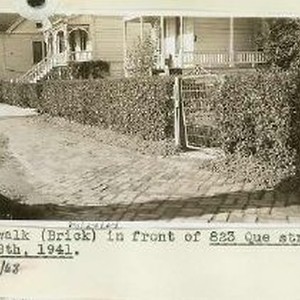 View of brick sidewalk in front of 823 Q Street. Two other houses are shown to the left.