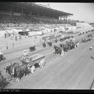 State Fair 1950 - Cows and wagons parade on track in front of grandstand.