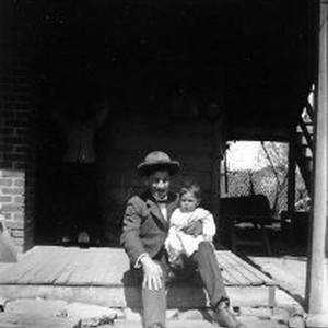 Homer Jones holds his baby daughter, Ivy, while seated on a porch.
