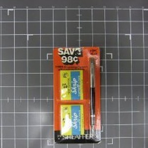 Sealed orange and black background with white and black print package of fountain pen and 2 packages of ink cartridges (a) Fountain pen, black plastic and silver metal with pocket clip on cap, Sheaffer brand (b&c) 2 packages of plastic ink cartridges