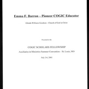 Text of paper by Glenda Williams Goodson, "Emma F. Barron: Pioneer COGIC educator", presented at the Auxiliaries in ministries (AIM), Church of God in Christ (COGIC) convention, St. Louis, Missouri, 2001 July 2-6. [Description English/roman)]