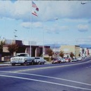 Print, color: Looking east at the intersection of Bodega Avenue (Hwy 12) and North High Street. The Sebastopol Public Library is seen to the extreme left and City Hall with the flagpole in front. Circa 1976.