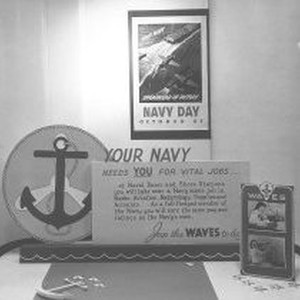 Window display promotes the Navy and says, "Your Navy Needs You" and "Join the WAVES today."