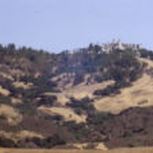 Rolling hills covered with trees and brush lead up to the Hearst Castle.