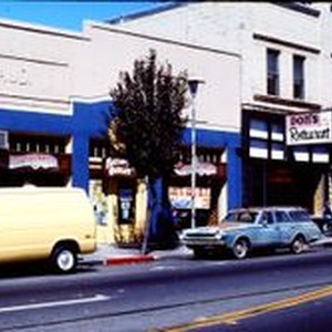 Slides, Kodachrome color transparency; The H. Reynaud Building on South Main Street that houses the Country Blues Factory Outlet store. Don's Restaurant is seen to the right. July, 1976.