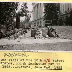 Typed on binder page "June 2nd, 1952. Upper steps at the N street entrance..Brick foundation of 1893". View of the base of the stairs in Capitol Park after being dismantled.