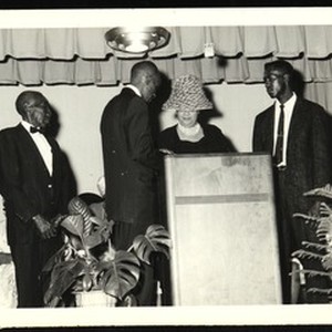 Packet 23: 3 photographs of unidentified people at podium, sitting at a table in a tent, standing conversing, [s.d.]. [Description English/roman)]