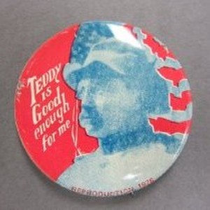 Reproduction. White text on red background. "Teddy is Good Enough for Me!" w/blue tinted image of Teddy Roosevelt