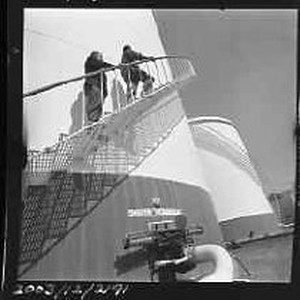 Petroleum tanks - Two men climbing stairs on side of tank.