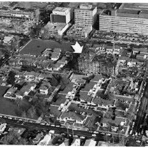Aerial view of Sacramento's financial district: "Bounded by P St. (foreground), 7th St. (at right), N and 5th Streets looking N.W. Far upper left - 1) Crocker Citizens National Bank under construction. 2) Wells Fargo Bank almost completed. 3) International Business Machine Corp. bldg. which opened in May 1963. 4) Block long Federal Courthouse and office building. Four block Capitol Tower Apts. development."