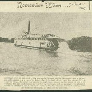 Photo of the sternwheeler Seminole as it moved down the Sacramento River to San Francisco. The ship was owned by Souther Pacific Railroad along with 3 others, all named for Indians. The phot o was from the newspaper in 1967.