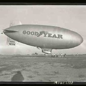 The Goodyear blimp "Volunteer NC-8-A" landing or taking off with crew holding mooring lines.