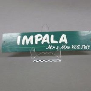 Nameplate, wood, painted green with white lettering "Impala Mr. and Mrs. W.G. Felt," Used as stall nameplate for horse.