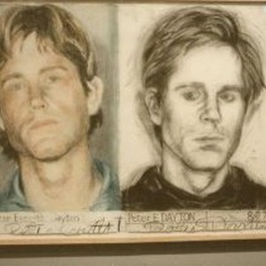 Acrylic and charcoal painting/drawing of two mug shots of "Peter Dayton." By artist Caitlin Mitchell of Oakland.
