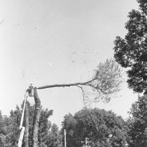 SERIES. Men and machines take down large tree at corner of 17th St. and Capitol Ave. Sacramento Barber and Beauty Supply visible on 17th St.