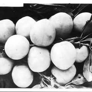 Photo, black and white: Plums on a branch. Handwritten on back: "Plum P-19 (So.Br.) July 1929."