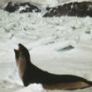 A seal with its head high and mouth open is sitting on ice.