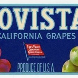 Crate label. Jovista Brand California Grapes, Earle Fruit Company San Francisco, Calif. Clusters of two kinds of grapes on blue background.