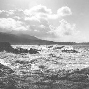 Waves coming from right of composition attached rocky shore framing bottom and left. Hills and clouds in the distance. Taken same day and same location as #1152.