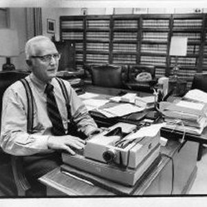 Justice Bertram D. Janes, sitting at the desk in his office, typing. He was about to retire. Caption: Judge Bertram Janes in his office in the Library and Courts building