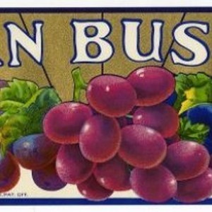 Crate label. C. R. Van Buskirk Tokays grapes, Lodi, California. Gold background, bunches of grapes, white lettering. Produce of U.S.A.