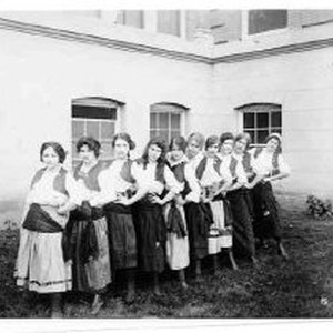 Ten girls in folk dancing costumes posed with hands on hips.