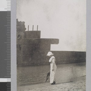 Charmian London stands at shoreline holding an umbrella. A wrecked vessel in background.