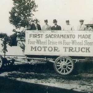 View of the first Sacramento-made "Four-wheel Drive and Four-Wheel Steer Motor Truck." Five men wearing suits pose in back of truck with huge sign. This motor company was in operation for 9 years (1913-22) and was located in the Price Villa Tract on 7th Ave. near Riverside (near Vic's Ice Cream Parlor, 2001). It had 3 reorganizations, 1 name change, 5 models proposed, 2 trucks manufactured, and 1 truck sold.