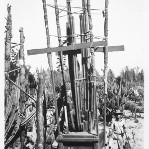 A worker stands next to a large bound and boxed pachycereus specimen on its way to its new home in the desert garden. The label that accompanies this photo in the album reads "Pachycereus marginata, D-42." In white on the bottom right, "W. Hertrich 1925."