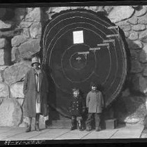 A woman and two children standing in front of a cross-cut section display of a redwood tree showing dates beginning with 923 A.D. and ending with 1860 A.D.