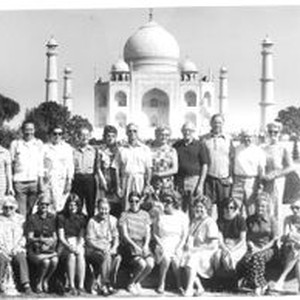 Photo--black and white: Cornelia "Bunni" Myers Streckfus Cogsdell with tour group in Agra, India at the Taj Mahal October 15, 1972. Handwritten on back of photo "16th Day" Bunni is fourth from right in seated row with ankles crossed. All other people are unidentified.